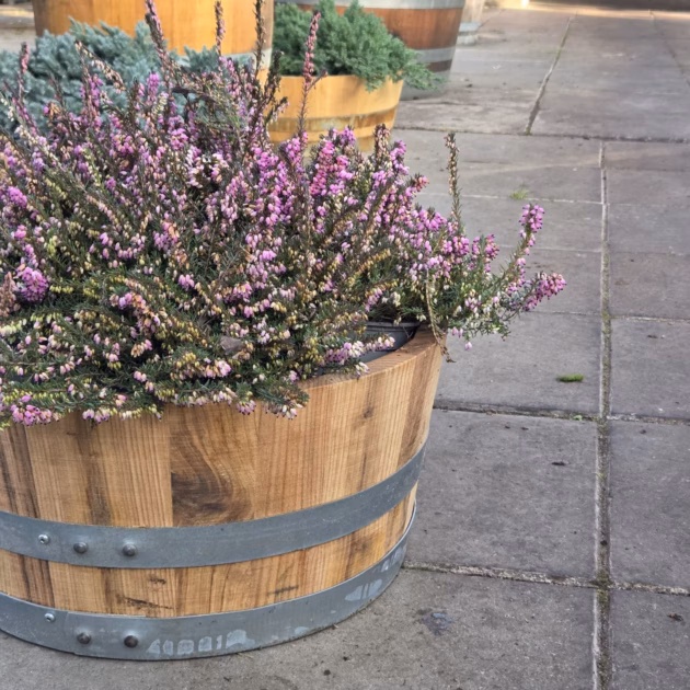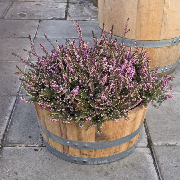 Kwart portvat beplant met Winter Heide (Erica carnea) is een combinatie van bloemkuip van een portvat met beplanting. Het vat heeft een overloopgaatje voor overtollig regenwater.