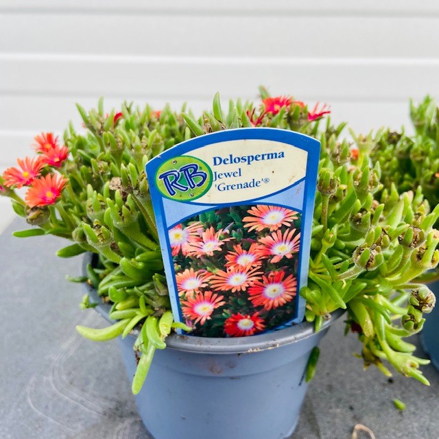 Delosperma Jewel ‘Grenade’ is een nieuwe generatie Delosperma die extreem langt bloeit vanaf het voorjaar tot de eerst vorst, met orange naar fel rode bloemen. Deze Delosperma is winterhard tot -15º Celsius. Deosperma Jewel ‘Grenade’ wordt tot 15 cm hoog en 30 cm breed. ‘Grenade’ verdraagt extreme omstandigheden zoals zoute felle zeewind, schurende zanddeeltjes, hoog oplopende temperaturen en droogte. Deze plant is kussenvormend.