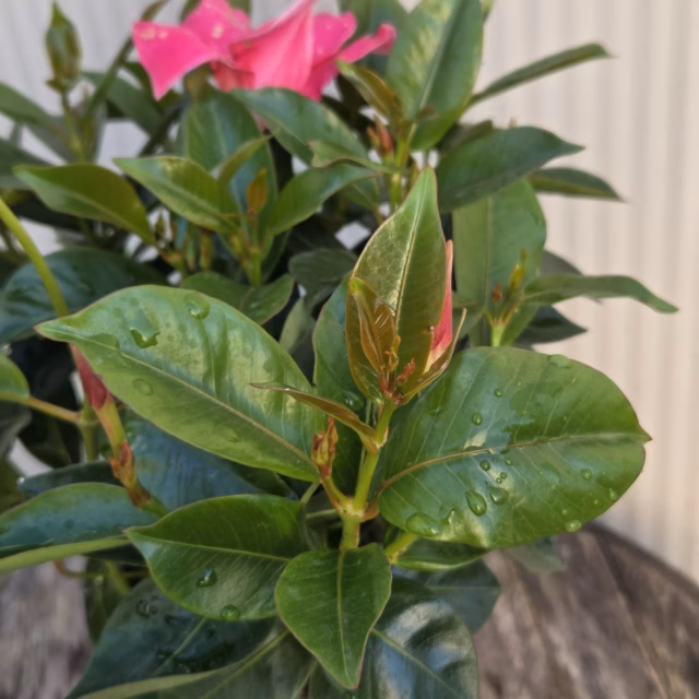 De roze Dipladenia is een vrolijke en exotisch ogende terrasplant die de hele zomer lang doorbloeit. Met haar diepgroene glanzende bladeren en trompetvormige bloemen trekt deze plant direct de aandacht. Ze is sterk, houdt van warmte en geeft maandenlang kleur aan potten, bloembakken of klimhulpen. Perfect voor wie op zoek is naar langdurige bloei zonder ingewikkeld onderhoud.