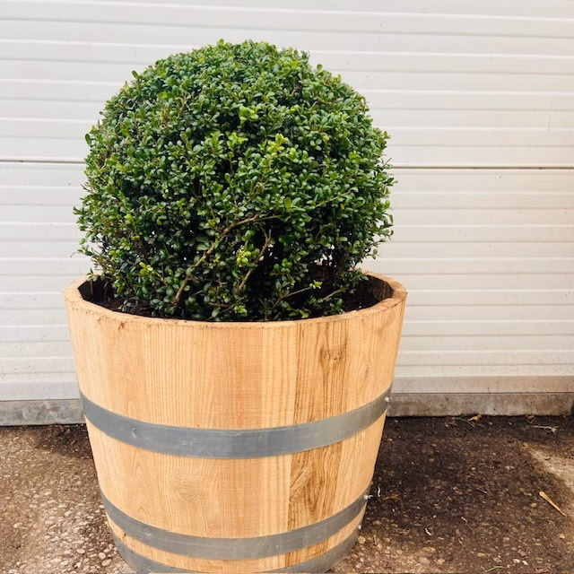Prachtige combinatie van strakke Ilexbol van 30 cm in een half vat. Voorheen werd hier een Buxusbol voor gebruikt.