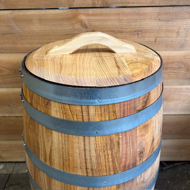 Wij oliën deze vaten met lijnolie voor een mooie uitstraling De banden wordt extra vast gezet aan het hout zodat ze altijd op hun plek blijven zitten.