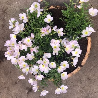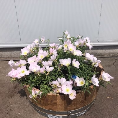 Vrolijke bloeiende Teunisbloemen in een kwart wijnvat van 50 liter. Bloeit het grootste deel van de zomer.