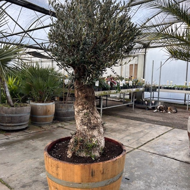 Een half wijnvat van 150 liter met olijfboom is een prachtige, robuuste combinatie die direct mediterrane sfeer brengt op terras of in tuin. De karaktervolle olijfboom met nostalgische stam staat stevig in een origineel wijnvat, wat zorgt voor een natuurlijke en tijdloze uitstraling. Een duurzame set die kant-en-klaar geleverd kan worden en meteen een indrukwekkend geheel vormt.