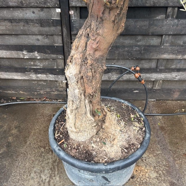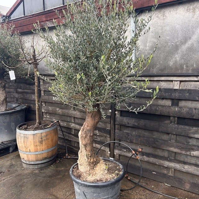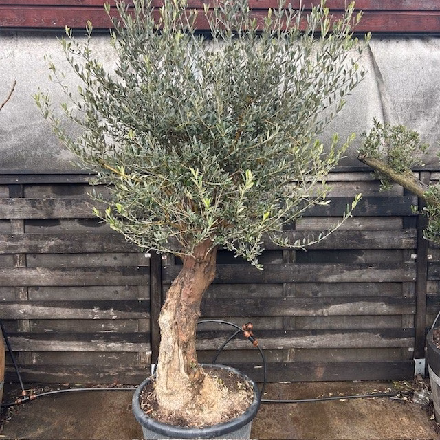 Als u een olijfboom koopt zit deze in de meeste gevallen in een grote zwarte pot, door veel mensen ook wel een specikuip genoemd. Deze zwarte pot is te klein voor de meeste bomen, de olijfboom kan hier niet in blijven staan. Als u een olijfboom overpot zet u hem in een bak of grotere pot die minimaal 30% grotere is dan de pot waar hij nu in staat. Als wij de boom in een half wijnvat hebben gezet voor u hoeft u uiteraard niets te doen. Gebruik bij het overpotten potgrond voor mediterrane planten.