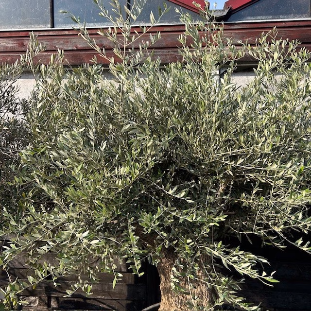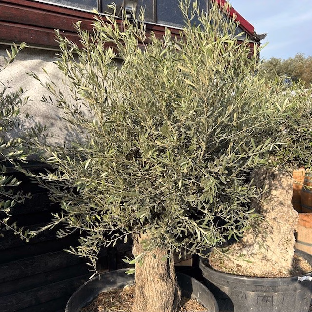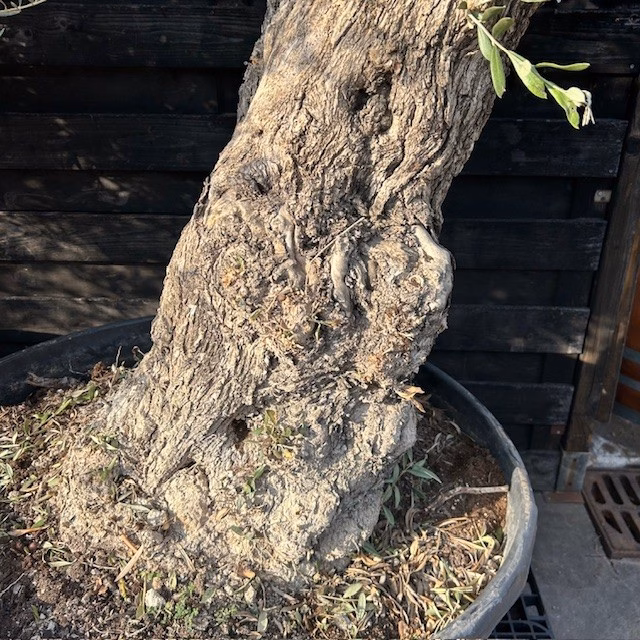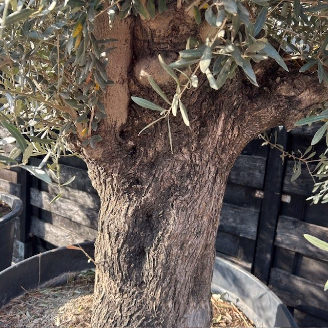 Olijfboom met dikke geleefde stam, Oude nostalgische Olijfboom in pot, Deze olijfboom is winterhard, Wij kunnen thuis bezorgen.