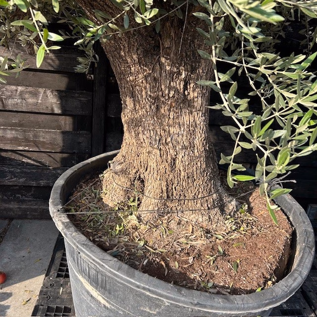 Als u een olijfboom koopt zit deze in de meeste gevallen in een grote zwarte pot, door veel mensen ook wel een specikuip genoemd. Deze zwarte pot is te klein voor de meeste bomen, de olijfboom kan hier niet in blijven staan. Als u een olijfboom overpot zet u hem in een bak of grotere pot die minimaal 30% grotere is dan de pot waar hij nu in staat. Als wij de boom in een half wijnvat hebben gezet voor u hoeft u uiteraard niets te doen. Gebruik bij het overpotten potgrond voor mediterrane planten.