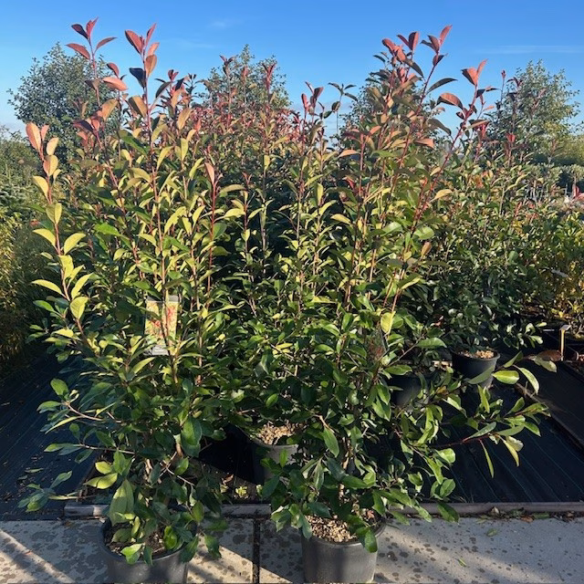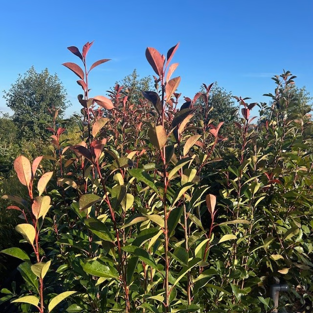 De Photinia fraseri ‘Red Robin’ of Glansmispel is een kleurrijke en levendige struik die het hele jaar door sierwaarde biedt. In het voorjaar loopt hij uit met schitterend rood, jong blad dat prachtig contrasteert met het donkergroene oudere blad. In mei verschijnen witte bloemtrossen die bijen aantrekken en zorgen voor een extra sierlijke uitstraling. Deze plant brengt structuur en kleur in elke tuin, zowel solitair als in een haag.