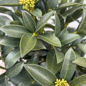 Skimmia geeft kleur in een donkere winter. Van oorsprong komt Skimmia Japonica ‘Rubella’ uit Oost Azië. De plant is zeer geliefd bij veel mensen vanwege zijn langdurige en mooie overvloedige bloei, van september t/m maart met prachtige rode bloemtrossen en daarna nog in april en mei met crème witte bloemen. Skimmia j. Fragant Cloud is een mooie frisse room witbloeiende Skimmia en heeft hiervoor witrode bloemtrossen.