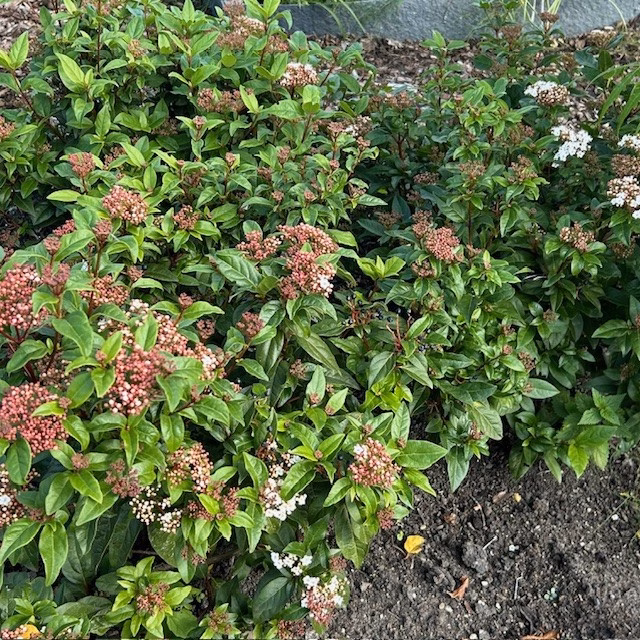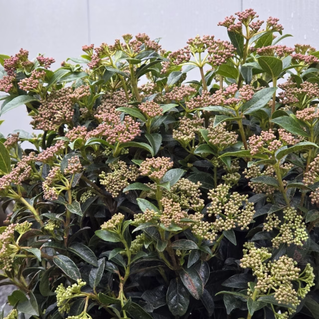 Viburnum tinus ‘Spirit’ heeft een zeer lange en rijke bloei. De knoppen zijn rood en de bloei is wit. Uiteindelijk komen er donkere bessen aan.