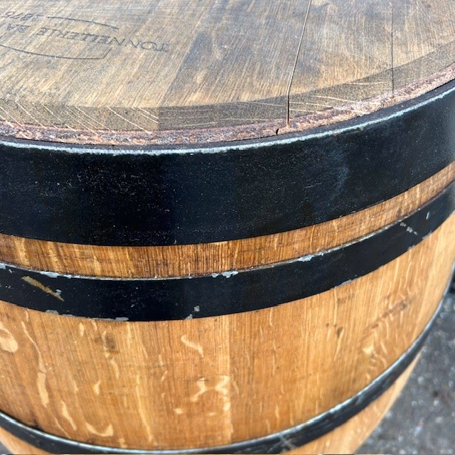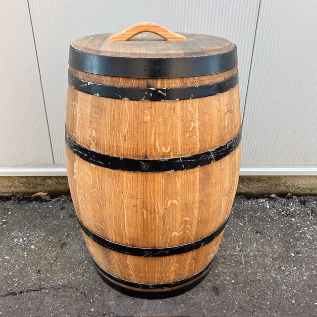 Eikenhouten wijnvat 225 liter met deksel, geolied met lijnolie en zwarte banden.